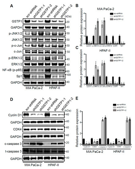 We used two independent short-hairpin oligonucleotides to knock down the expression of GSTP1. Lentiviral particles containing the shRNA (Sigma, St. Louis, MO, USA, catalogue# SHCLNV-NM_000852) were used to infect the target PDAC cell lines with polybrene (Sigma-Aldrich, St. Louis, MO, USA). Transfected cells were selected over five days with 5 μg/mL puromycin. The short-hairpin sequences used to achieve the knockdown of GSTP1 expression were: shGSTP1-1, CCGGCCTCACCCTGTACCAGTCCAACTCGAGTTGGACTGGTACAGGGTGAGGTTTTG; shGSTP1-2, CCGGC GCTGACTACAACCTGCTGGACTCGAGTCCAGCAGGTTGTAGTCAGCGTTTTTG. Scrambled GSTP1 shRNA, empty vector (pLKO.1), and shRNA targeting GFP were used as controls. Knockdown was confirmed by qRT-PCR and Western blotting techniques.