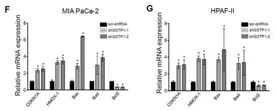 To elucidate the role of GSTP1 in cell proliferation and cell survival, we also analyzed the expression of extracellular signal-regulated kinase (ERK1/2), the p65 subunit of NF-κB, and specificity protein 1 (Sp1) transcription factor in GSTP1 knockdown cells. GSTP1 knockdown cells had low levels of phosphorylated ERK1/2 and p65, and reduced Sp1 compared to the scrambled control MIA PaCa-2 and HPAF-II cells (Figure 4A–C). To explain the cell-cycle arrest phenotype of GSTP1 knockdown PDAC cells, we also investigated the expression of important cell cycle regulators. Interestingly, we found a large reduction in cyclin D1 protein expression and a moderate decrease in CDK4 protein expression (Figure 4D,E). We also found elevated mRNA expression of the cyclin and CDK complex inhibitor, CDKN1A (p21) (Figure 4F,G). Further, pro-apoptotic protein, cleaved caspase-3 (Figure 4D,E), and genes, Bax and Bak (Figure 4F,G), were up-regulated, while the anti-apoptotic gene Bcl2 was downregulation in GSTP1 knockdown PDAC cells. HMOX1, an oxidative stress-associated gene, was also upregulated in GSTP1 knockdown PDAC cells (Figure 4F,G).
