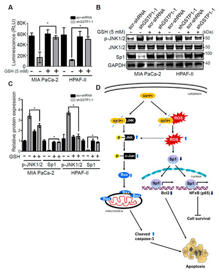 Exogenous antioxidant rescues the cytotoxic effects of GSTP1 knockdown in PDAC cells. Control and GSTP1 knockdown MIA PaCa-2 and HPAF-II cells were treated with 5 mM GSH for 72 h. (A) CellTiter-Glo® assays were used to evaluate the average cell viability for three independent experiments with eight technical replicates for each. The luminescence (cell viability) was compared between shGSTP1-1 with and without GSH treatment. Student’s t-test was used to identify significant differences in growth in GSTP1 knockdown cells treated with or without GSH. RLU: relative luminescence units (B) Effects of GSH treatment on the phosphorylation of JNK1/2 and expression of Sp1 were determined using Western blotting. Total JNK and GAPDH were used as loading controls for the experiment. The figure shows one representative image of three independent experiments. Similar results were obtained in duplicate experiments. (C) Protein expression in two independent experiments was quantified using densitometry. p-JNK1/2 and Sp1 protein expression levels were compared between shGSTP1-1 with and without GSH treatment. Student’s t-test was used to identify the significant differences in protein expression in the GSTP1 knockdown cells treated with or without GSH. (D) Proposed mechanisms underlying the role of GSTP1 in pancreatic cancer cell proliferation, survival, and apoptosis based on Western blotting and qRT-PCR data. For all figures, * denotes statistically significant differences (p < 0.05). Unprocessed images for the Western blotting results are shown in Figure S1.