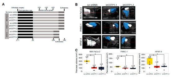 Intrigued by the in vitro growth inhibitory effects of GSTP1 knockdown, we next explored these effects in an orthotopic animal model of PDAC. Control and GSTP1 knockdown MIA PaCa-2, PANC-1, and HPAF-II cells were orthotopically transplanted into the pancreata of nude mice (Figure 6A). The tumor volume was monitored every ten days using FUJIFILM Vevo3100 ultrasound imaging system and was compared among the control and the GSTP1 knockdown groups. At the conclusion of the experiment, we observed decreased tumor growth via abdominal ultrasounds in GSTP1 knockdown groups compared to the controls (Figure 6B,C). Furthermore, our results show that GSTP1 knockdown PDAC cells generated significantly smaller tumors (p < 0.05) with a 50–80% reduction in tumor weight compared to the control (Figure 6D,E).