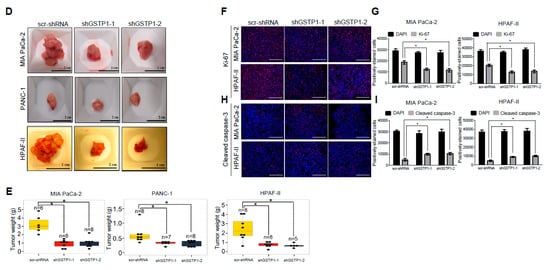 To explain the dramatic reduction in tumor size in GSTP1 knockdown cells, we evaluated the expression of the nuclear proliferation marker Ki-67 and the apoptotic marker cleaved caspase-3 by immunohistochemistry in mouse tumor tissues. The scrambled controls from the two PDAC cell lines showed 64% and 67% Ki-67-positive cells (Figure 6F). In comparison, tumors obtained from GSTP1 knockdown cells showed a notable reduction in Ki-67 expression for MIA PaCa-2 (37% and 35% for shGSTP1-1 and shGSTP1-2, respectively) and HPAF-II (38% and 29% for shGSTP1-1 and shGSTP1-2, respectively) (Figure 6G). Additionally, tumors obtained from GSTP1 knockdown cells showed an impressive increase in the expression of cleaved caspase-3 compared to the scrambled controls (Figure 6H,I). These data provide additional affirmation that GSTP1 knockdown impedes proliferation and promotes cell death via apoptosis in PDAC cells in vivo.