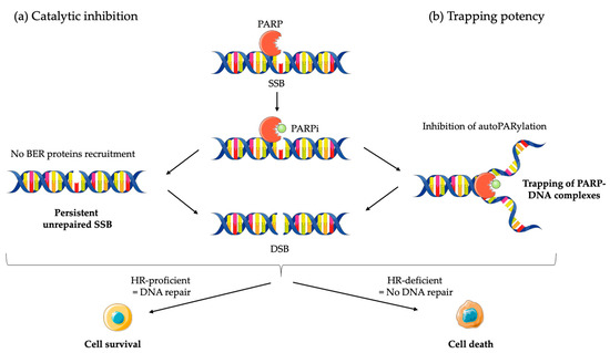 Mechanisms of action of PARP inhibitors (PARPi): (a) PARPi impedes PARP enzyme activity (or catalytic inhibition) and interferes with repair of single strand breaks (SSB) by disrupting the base excision repair (BER) pathway; (b) PARPi also causes trapping of PARP proteins on DNA by inhibiting autoPARylation. In homologous recombination (HR) proficient normal cells, DNA is repair and cell survive. The result in unresolved DNA double strand breaks (DSB) in HR deficient cells leads to cell death.