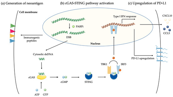 In clinical practice, the antitumor activity of PARPi has been observed in patients with platinum-sensitive tumors regardless of BRCA1/2 mutation or HRD status, suggesting an alternative mechanism unrelated to conventional lethal synthetic-mediated cytotoxic effects [60]. The use of PARPi treatment leads to unresolved DNA lesions and to the production of cytosolic dsDNA fragments. The accumulation of cytosolic DNA activates in turn the DNA sensing cGAS-STING pathway and boosts production of type I interferon to induce antitumor immunity independently of DNA repair deficiency [131,132,133] (Figure 2b). These critical changes amplify STING signaling and its associated-transcription programs, thereby promoting TILs and antitumor immunity [132,133]. Moreover, it leads to increased levels of chemokines, such as CXCL10 and CCL5, that induce the activation and function of cytotoxic CD8+ T cell [132,133]. In addition, these effects of PARPi are further enhanced by ICI, providing a mechanistic rationale for the use of PARPi as immunomodulatory agents to harness the therapeutic efficacy of immunotherapy [134].