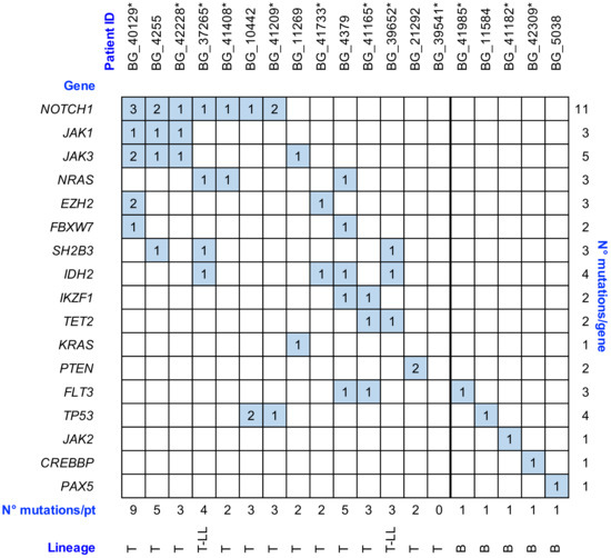 A statistical analysis performed on the co-occurrence of gene variants, although a limited number of patients were molecularly profiled, demonstrated a statistically significant association between JAK1 and JAK3 (p = 0.004) and JAK1 and NOTCH1 (p = 0.04). Moreover, in the T-LL studied samples, we identified the association of IDH2 mutations and the presence of variants involving SH2B3 (p = 0.09), while the co-occurrence of FLT3 and IKZF1 variants was observed in two out of three T-ALL cases. We did not observe any association between gene variants and specific Ig/TCR rearrangements. Of note, several variants (ranging from two to five) were identified in three patients in whom no Ig/TCR rearrangements were recognized.