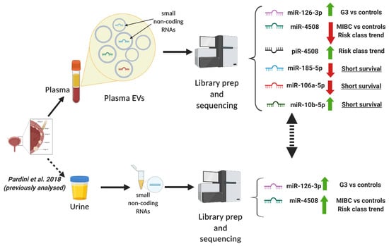 In the present study, we investigated sncRNA profiles by next-generation sequencing (NGS) in plasma-derived EVs from BC patients and healthy controls with the aim of finding potential non-invasive biomarkers for the diagnosis and prognosis of BC. Additionally, we compared the current results with the sncRNA expression data measured in urine from the same patients previously reported by our group [] (Figure 1).