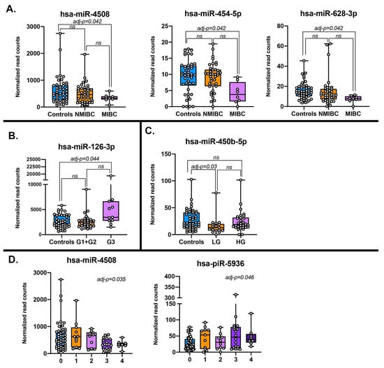 For the tumor type, the only comparison yielding differentially expressed sncRNAs was MIBC versus controls. Specifically, four miRNAs were downregulated in MIBC: miR-4508 (adj-p = 0.04), miR-454-5p (adj-p = 0.04), miR-628-3p (adj-p = 0.04), and miR-3140-3p (adj-p = 0.01). However, results should be taken cautiously since only miR-4508 had high read counts (653 on average) while the other three miRNAs were much less abundant (less than 20) with miR-3140-3p having 3.2 reads on average (not shown) (Figure 2A, Table 2).