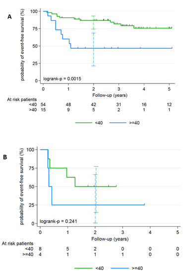 Kaplan–Meier analyzes of the EFS for anal SCC according to the T-MTV defined with a segmentation of 35% of the SUVmax threshold and stratified on gender: (A) female population and (B) male.
