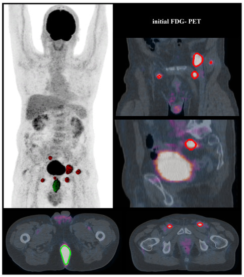A T4N0 anal SCC was diagnosed at a 71-year-old patient. Initial FDG-PET modified the tumour staging as T4N3 due to an observed extended lymph node involvement (bilateral inguinal, perirectal and external iliac positive nodes). The T-MTV was 70.1 cm3 (with 35% SUVmax threshold). Imaging showed residual disease three months after the end of treatment, confirmed by pathological results of surgery. (Segmented volumes: for tumour in green, for lymph nodes in red).