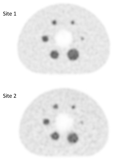 Quantitative assessment of FDG PET images obtained at site 1 (GE Discovery 690 PET scanner) and at site 2 (Siemens Biograph mCT 64 PET scanner). Sphere volumes correspond to sphere diameters of 10, 13, 17, 22, 28 and 37 mm.