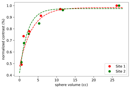 The eighty-one examinations were performed using two types of PET-CT scanner. Forty-four with a Discovery 690 (GE Healthcare, Chicago, IL, USA) PET-CT system, and 37 with a Siemens Biograph mCT 64 (Siemens Healthcare Molecular Imaging USA Inc., Malvern, PA, USA). Because the PET-CT equipment in our institution is located at two different sites, it was necessary to evaluate any differences in contrast recovery coefficients of the reconstructed images to allow semiquantitative data pooling. This evaluation was carried out using a NEMA 2012-IEC 2008 phantom equipped with six spheres of 10, 13, 17, 22, 28, 37 mm in diameter. These six spheres were filled with an FDG activity concentration 5 times higher than the one filled in the tank. The images obtained at the two sites were reconstructed with the standard reconstruction parameters for each of the systems. A visual analysis did not show any difference (Figure 3), which was confirmed by the analysis of the recovery contrast curve (Figure 4). After a fast of at least 4 hours, 3 MBq/kg of FDG was injected intravenously. The acquisition was performed 60 ± 5 min after injection, from the base of the skull to the thighs, with the arms held above the head. The low-dose CT was performed according to a standardized protocol and preceded the PET acquisition (OSEM iterative reconstruction algorithm, two iterations, 24 subsets).