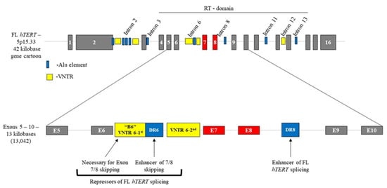 - Ulaner, G.A.; Hu, J.F.; Vu, T.H.; Giudice, L.C.; Hoffman, A.R. Tissue-specific alternate splicing of human telomerase reverse transcriptase (hTERT) influences telomere lengths during human development. Int. J. Cancer 2001, 91, 644–649. [Google Scholar] [CrossRef]