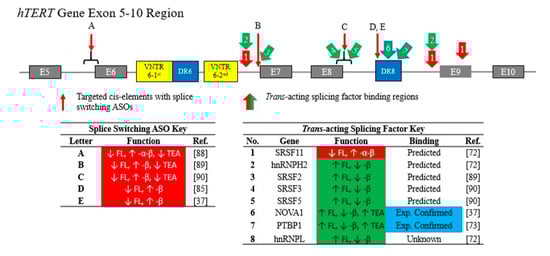 - Wong, M.S.; Wright, W.E.; Shay, J.W. Alternative splicing regulation of telomerase: A new paradigm? Trends Genet. 2014, 30, 430–438. [Google Scholar] [CrossRef] [PubMed]