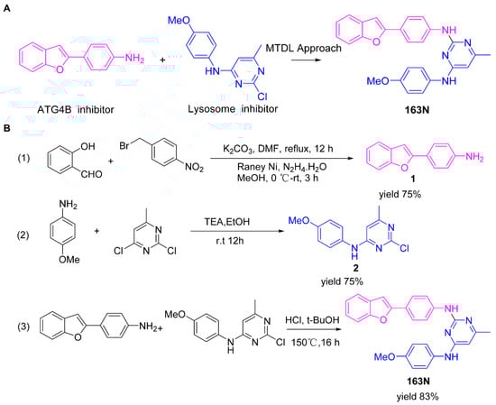 Figure 1. Graphical synthetic route of 163N. (A) The structure of 163N carries both 2-phenylbenzofuran and 6-methylpyrimidine-2,4-diamine. (B) Synthesis of 163N.