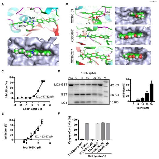 Figure 2. 163N inhibits the activity of ATG4B. (A) Predicted binding model of compound 163N binds to ATG4B (Protein Data Bank (PDB) ID: 2CY7) pocket. 163N can form hydrogen bonds with residues Pro260 and Asn261 of ATG4B (yellow dotted lines). (B) Predicted binding model of compound XOS00163, XOS00201, and XOS00207 bind to ATG4B (PDB ID: 2CY7) pocket. (C) IC50 calculation of 163N for ATG4B from fitted curve by fluorescence resonance energy transfer (FRET) assay. (D) ATG4B (1 µg/mL) was incubated with different concentrations of 163N (5, 10, 20, 50 µM) at 37° for 30 min, then LC3B-GST was added to the mixture and incubated at 37° for another 30 min. SDS-PAGE was used to detect the inhibitory effect of 163N. The inhibition rate (%) was calculated based on the band density and quantified. Data are presented as mean ± SEM from three individual experiments. (E) Measurement of the IC50 of 163N for ATG4A by FRET assay. (F) Measurement of the specificity of 163N against other cysteine proteases. HeLa cells were treated with 1 µM of staurosporine (SP) for 12 h to induce cell apoptosis. Then, 2 µg of the whole cell lysate were mixed with indicated compounds at 37° for 30 min, Ac-DEVE-AFC (25 µM) were then added to a volume of 50 µL, and the emission of 505 nm for AFC was recorded.
