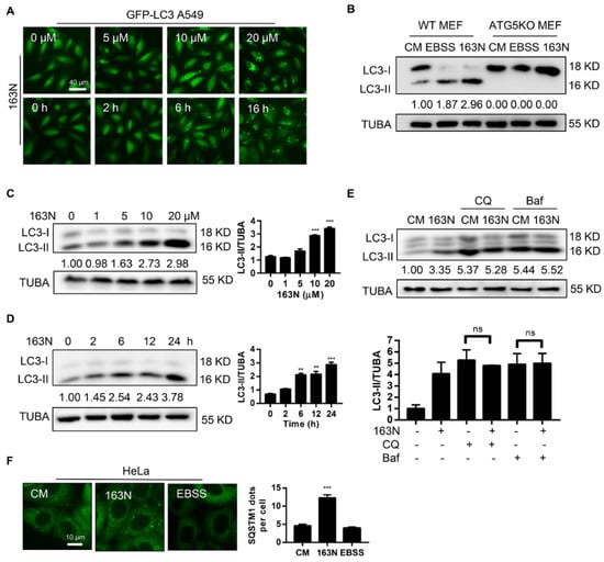 Figure 3. 163N inhibits autophagic flux. (A) A549 cells expressing GFP-LC3B were treated with 163N for 6 h at different concentrations or treated with 163N (10 µM) over a certain time course, then the distribution of GFP-LC3B was examined. (B) Wild type (WT) Mouse Embryonic Fibroblast cells (MEFs) or ATG5KO MEFs were treated with 163N (10 µM) for 6 h, or EBSS for 2 h for western blotting assay. (C) HCT116 cells treated with different concentrations of 163N (1, 5, 10, 20 µM) for 6 h were analyzed by western blotting for endogenous LC3B. The ratio of LC3B-II/TUBA was calculated using ImageJ software. (D) HCT116 cells treated with 163N (10 µM) over a certain time course were analyzed by western blotting for endogenous LC3B. The ratio of LC3B-II/TUBA was calculated using ImageJ software. (E) HeLa cells were treated with 163N (10 µM) with or without CQ (40 µM) or bafilomycin A1 (Baf) (0.5 µM) for 6 h, and then endogenous LC3B was analyzed by western blotting. The ratio of LC3B-II/TUBA was calculated using ImageJ software. (F) HeLa cells were treated with 163N (10 µM) for 6 h, or EBSS for 2 h, and then immunostaining was used to detect SQSTM1 dots, and the number of SQSTM1 dots was quantified. The LC3-II intensities in relation to TUBA are shown in this Figure, and the uncropped blots and molecular weight markers are shown in Figure S7. Data are presented as mean ± SEM from three individual experiments. ** p < 0.01, *** p <0.001, ns, not significant.