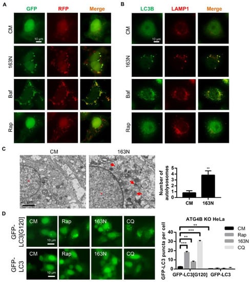 Figure 4. 163N increases the accumulation of autolysosomes. (A) HEK293A cells expressing green fluorescent protein (GFP)-red fluorescent protein (RFP)-LC3 were treated with 163N (10 µM), rapamycin (Rap) (1 µM) or Baf (0.5 µM) for 6 h, then the colocalization of GFP and RFP puncta was detected. (B) HeLa cells were treated with 163N (10 µM), Rap (1 µM) or Baf (0.5 µM) for 6 h, then immunostaining was used to detect LC3B and LAMP1. The colocalization of LC3B and LAMP1 was measured. (C) HeLa cells were treated with 163N (10 µM) for 6 h, then transmission electron microscopy (TEM) was used to detect the ultrastructure of HeLa cells. Red arrows indicate normal autolysosome structures. (D) ATG4BKO HeLa cells expressing GFP-LC3[G120] or full length GFP-LC3 were treated with Rap (1 µM), 163N (10 µM), or CQ (40 µM) for 6 h, then the distribution of GFP-LC3 was examined. And the number of GFP-LC3 dots were quantified. Data are presented as mean ± SEM from three individual experiments. * p < 0.05, ** p < 0.01, *** p < 0.001.