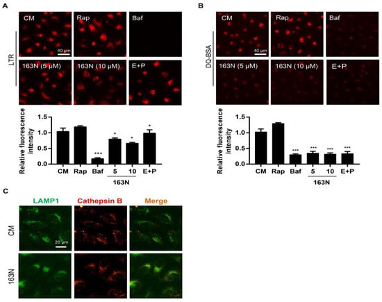 Figure 5. 163N causes lysosome dysfunction. (A) HeLa cells were treated with Rap (1 µM), Baf (0.5 µM), E64D (25 µM) plus pepstatin A (50 µM) or different concentrations of 163N (5 or 10 µM) for 6 h, then LysoTracker Red (LTR, 25 ng/mL) was used to stain for 30 min, then the relative LTR fluorescent intensity was quantified. (B) HeLa cells were firstly incubated with 10 µg/mL DQ-BSA in EBSS medium for 1.5 h and then treated with Rap (1 µM), Baf (0.5 µM), E64D (25 µM) plus pepstatin A (50 µM) or different concentrations of 163N (5 or 10 µM) for another 6 h, then the relative DQ-BSA fluorescent intensity was quantified. (C) HeLa cells were treated with or without 163N (10 µM) for 6 h, followed by immunostaining using cathepsin B and LAMP1 antibody. The colocalization of cathepsin B and LAMP1 was measured. Data are presented as mean ± SEM from three individual experiments. * p < 0.05, *** p < 0.001.
