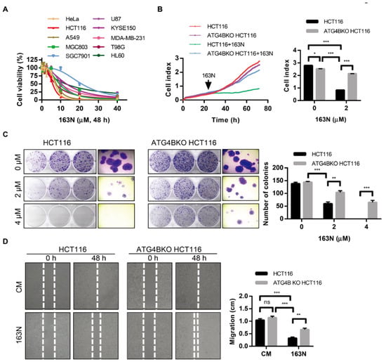 Figure 6. 163N suppresses the growth of colorectal cancer cells in vitro. (A) HeLa, HCT116, A549, MGC803, SGC7901, U87, KYSE150, MDA-MB-231, T98G, and HL60 cells were treated with various concentrations of 163N, and CCK-8 assay was performed to assess cell proliferation. (B) HCT116 and ATG4BKO HCT116 cells (2500 per well) were seeded before treated with 163N (2 µM), and 0.1% Dimethyl-sulfoxide (DMSO) was used as a control. The real-time cellular analysis (RTCA) plots were generated using RTCA software 1.1.2, and the cell index was analyzed with GraphPad 7.0 software. (C) HCT116 and ATG4BKO HCT116 cells were treated with a series of concentrations of 163N. Colony formation assay was then monitored by crystal violet staining. The number of the clones were counted and quantified. (D) HCT116 and ATG4BKO HCT116 cells were treated with or without 163N (10 µM) for 48 h, wound healing was recorded (left) and quantitatively analyzed (right). Data are presented as mean ± SEM from three individual experiments. * p < 0.05, ** p < 0.01, *** p < 0.001.