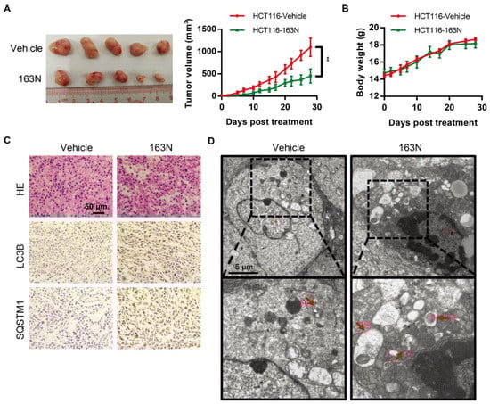Figure 7. 163N inhibits tumor growth in a HCT116 mouse xenograft model. (A) HCT116 cells (3 × 106) were injected subcutaneously into the right flank of the immunodeficient nu/nu female mice. Seven days after tumor cell implantation, mice with palpable tumors were divided randomly into two groups and injected intraperitoneal on Monday, Wednesday, and Friday with either corn oil vehicle or 163N (50 mg/kg). Tumor volumes were calculated by the length and width measured by Vernier calipers every 2 d. (B) Body weight changes of mice during 28 d of exposure. (C) Tumor tissues were sectioned and subjected to H&E staining and immunohistochemistry for evaluating histological morphology, and expression of LC3B and SQSTM1. Scale bar: 50 µm. (D) TEM was used to detect the ultrastructure of the representative tumor tissues. Red arrows represent normal autolysosome structures. Data are presented as mean ± SEM. ** p < 0.01 vs VC.