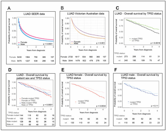 Females with lung adenocarcinoma (LUAD) and wild type (wt) TP53 outlive other LUAD patients. Overall survival data for LUAD (A) male (blue) and female (pink) patients from US Surveillance, Epidemiology, and End Results Program (SEER) data (2012–2016) and (B) male (orange) and female (purple) patients from Australian Victorian data (2013–2017). LUAD patient overall survival in The Cancer Genome Atlas (TCGA), (C) according to either wt TP53 (green) or mutant TP53 status (black); then for (D) females stratified for wt TP53 (pink) and mutant p53 status (red) and males stratified for wt TP53 (light blue) and mutant TP53 status (dark blue). Also shown separately for (E) women and (F) men. The numbers of patients corresponding to each cohort are tabulated below each plot. ‘p’ is the p-value for differences in survival time between cohorts (significant p-value < 0.05). Refer to Section 4. Materials and Methods for description of methodology and datasets utilized in survival analysis.