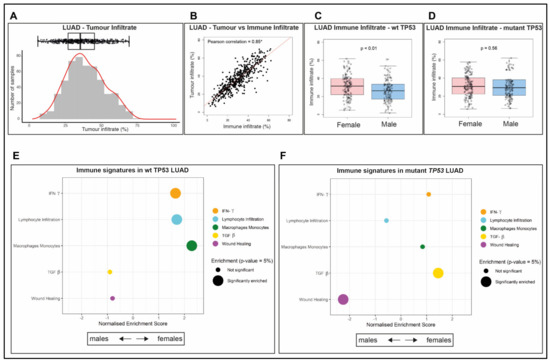 Female LUAD is highly immune infiltrated and enriched for specific immune signatures. (A) Proportion of tumor infiltrate in each TCGA LUAD sample. (B) Correlation between the proportion of tumor infiltrate and immune infiltrate in these samples. A Pearson correlation coefficient with the symbol * indicates the correlation is significantly different from 0, using the Spearman’s test of significance (p-value < 0.05). Proportion of immune infiltrate for females compared to males in LUAD samples with either (C) wt TP53, p-value < 0.01, or (D) mutant TP53, p-value = 0.56, using analysis of variance (ANOVA) to measure significance (p-value < 0.05). Gene Set Enrichment Analyses (GSEA) for immune signatures analyzing differentially expressed genes in LUAD females relative to males with (E) wt TP53 or (F) mutant TP53. Significantly enriched immune signatures (p-value < 0.05) are denoted by a large dot.