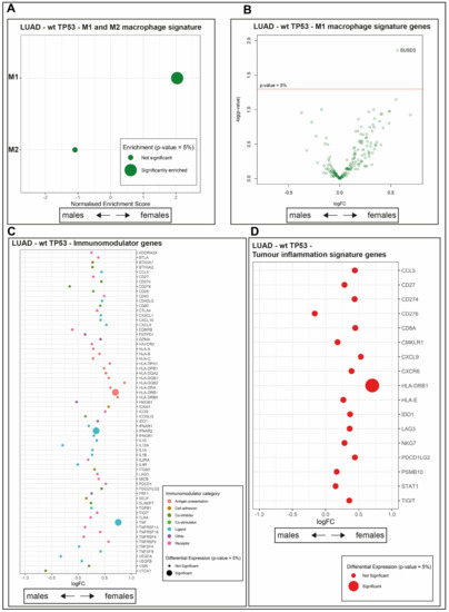 Sex-disparity in expression of immune genes in wt TP53 LUAD. Comparison of immune infiltrate genes expression between LUAD wt TP53 females and LUAD wt males using (A) GSEA of M1 and M2 macrophage genes, (B) differential gene expression analysis of M1 macrophage genes (with gene name assignment for p-values < 0.05), (C) differential gene expression of immunomodulator signatures, and (D) differential gene expression of tumor inflammation signature (TIS) genes. For panels A, C and D; significantly enriched immune signatures/genes (p-value < 0.05) are denoted by a large dot, respectively. A positive log fold change (logFC) demarks higher differential gene expression in females, while negative values indicate higher levels in males.