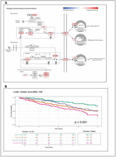 The wt TP53 LUAD females are enriched in antigen processing and presentation pathways with links to longevity. Numerous immune signature genes that were identified to be most highly differentially expressed in wt TP53 LUAD in females, compared to their counterpart males, occur in the Kyoto Encyclopedia of Genes and Genomes (KEGG) antigen processing and presentation pathways as depicted (A). Note in this pathway diagram, Major Histocompatibility Complex Class II DR Beta 1 (HLA-DRB1) is referred to as Major Histocompatibility Complex, Class II (MHCII). Pathway genes with a positive log fold change (logFC) in females are outlined in red, while those with a negative logFC would be shaded blue (i.e., those more highly expressed in males). Grey outline indicates a logFC close to zero (i.e., similar expression levels between females and males). Genes with significant differential expression (p-value < 0.05) are indicated with a red asterisk. (B) Survival analyses for LUAD patients stratified by TP53 mutation status (wt or mutant) and the relative expression levels of the three gene signature: Sushi Domain Containing 3 (SUSD3), Major Histocompatibility Complex Class II DR Beta 1 (HLA-DRB1), and Tumour Necrosis Factor (TNF). The numbers of males and females corresponding to each cohort, stratified for high or low expression of the respective genes, in either a wt or mutant TP53 context are tabulated below each plot. The ‘p’ is the p-value for the log-rank test of differences in survival time (significant p-value < 0.05).