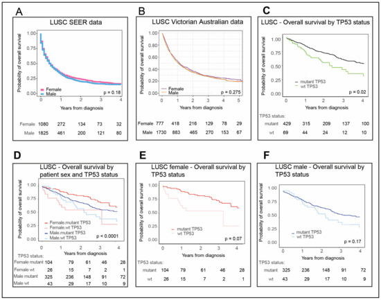 LUSC patient survival is longer for patients with mutant TP53 than wt TP53. LUSC overall survival data for (A) male (blue) and female (pink) patients in the US SEER datasets. (B) Male (orange) and female (purple) patients from Australian Victorian data. (C) LUSC patient overall survival in TCGA according to either wt p53 (green) or mutant p53 status (black), then for (D) females stratified for wt p53 (pink) and mutant p53 status (red) and males stratified for wt p53 (light blue) and mutant p53 status (dark blue). Also shown separately for (E) females and (F) males. The numbers of patients corresponding to each cohort are tabulated below each plot. The ‘p’ is the p-value for the log-rank test of differences in survival time between cohorts (significant p-value < 0.05). Refer to Section 4. Materials and Methods for description of methodology and datasets utilized in survival analysis.
