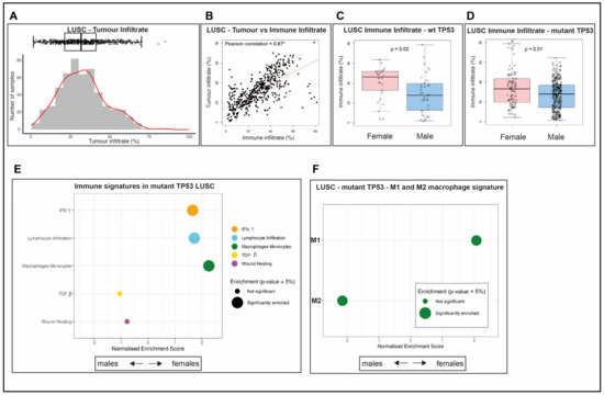 LUSC tumor infiltrate has a distinct immune content from LUAD. (A) Proportion of tumor infiltrate in each TCGA LUSC sample. (B) Correlation between the proportion of tumor infiltrate and immune infiltrate in these samples. A Pearson correlation coefficient with the symbol * indicates the correlation is significantly different from 0, using the Spearman’s test of significance (p-value < 0.05). Proportion of immune infiltrate for females compared with males in LUSC samples with either (C) wt TP53, p-value = 0.02, or (D) mutant TP53, p-value < 0.01, using analysis of variance (ANOVA) to measure significance (p-value < 0.05). GSEA of differentially expressed genes in LUSC females relative to males with mutant TP53 for (E) immune signatures (F) M1 and M2 macrophage signatures. Significantly enriched immune signatures (p-value < 0.05) are denoted by a large dot.