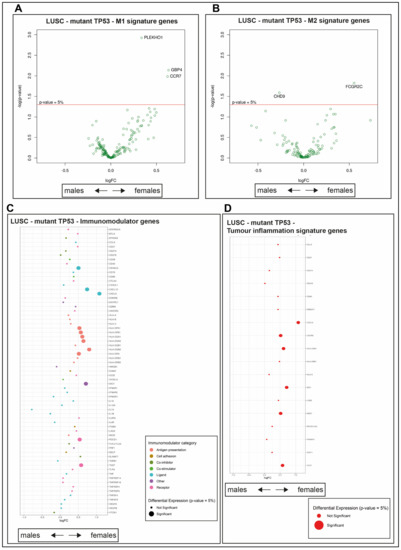 Sex disparity in expression of immune genes in mutant TP53 LUSC. Differential expression analysis of (A) M1 and (B) M2 macrophage genes (with gene name assignment for p-values < 0.05) (C) differential expression of immunomodulator gene signature genes, and (D) differential expression of tumor inflammation signature (TIS) genes. Significantly enriched genes (p-value < 0.05) are denoted by a large dot. A positive log fold change (logFC) demarks higher differential gene expression in females, while negative values indicate higher levels in males.