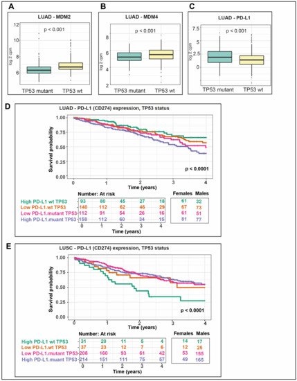 TP53 regulators and immune gene targets are expressed distinctly in LUAD and LUSC. In LUAD with wt TP53, expression is higher for its negative regulators (A) MDM2 and (B) MDM4, compared to those with mutant TP53. (C) PD-L1 expression is higher in LUAD mutant TP53 compared with wt TP53. Propensity scores were included and significance is p < 0.05. Survival differed between patients according to TP53 mutation status and PD-L1 expression levels in (D) LUAD and (E) LUSC.