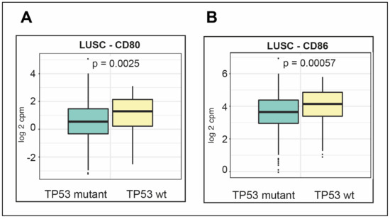 Expression of the ligands of cytotoxic T-Lymphocyte Associated Protein 4 (CTLA-4): CD80 molecule (CD80) and CD86 molecule (CD86) were not significantly altered between wt and mutant TP53 LUAD (data not shown); while, in contrast, in LUSC they were significantly higher in mutant TP53 compared with wt TP53 (Figure 9A, CD80 p = 0.0025 and Figure 9B, CD86 p = 0.00057).