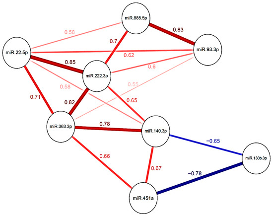 Figure 1. Correlation among the miRNAs included in the predictive model of post-surgical PE in glioma patients. Spearman correlation coefficients between two miRNAs are depicted next to the lines. Positive correlations are represented by red positive correlation values and red lines; negative correlations are represented by blue negative correlation values and blue lines. The degree of correlation is represented by the intensity of the number and the line and by the thickness of the lines, the more intense and thicker the line between two miRNAs, the strongest the correlation.