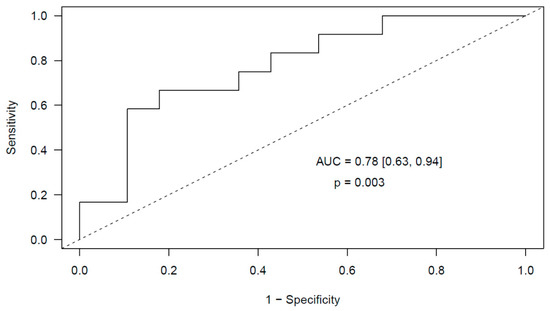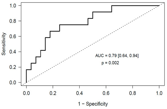 To evaluate whether markers of neutrophil activation combined with miRNAs improved the predictive capability of the individual models, we adjusted a new multivariable elastic net logistic regression model that included MPO and miR-140-3p as predictors, achieving an AUC of 0.79 (95% CI [0.64, 0.94], p = 0.002) (Figure 5), which became 0.76 after correction for optimism.