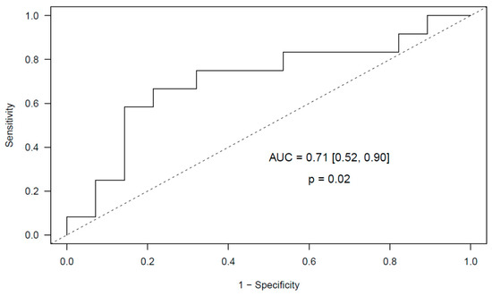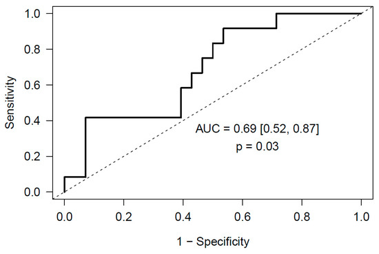 Next, we validated the predictive ability of our model in the cohort of 40 meningioma patients. In them, we could quantify by RT-qPCR using specific primers the expression level of all 6 miRNAs comprised in the model. In this validation stage, we obtained a ROC curve AUC of 0.69 (95% CI [0.52, 0.87], p = 0.03) (Figure 3).