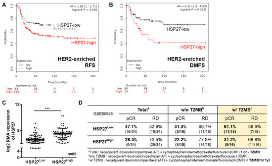 Heat shock protein 27 (HSP27) plays a negative prognostic role in human epidermal growth factor receptor 2 (HER2)-positive breast cancer (BC). (A) The relapse-free survival rate of patients with different HSP27 expression levels was assessed through a survival analysis using a KM plotter (http://kmplot.com/analysis). A total of 251 patients were included in the analysis. * p = 0.046, log rank test. (B) The distant metastasis–free survival probability of HSP27-high and -low patients was analyzed using KM plotter. A total of 119 patients were involved in the assessment. ** p = 0.0041, log rank test. (C) A total of 114 HER2+ patients from GSE50948 were classified into two groups. Those with a log2 robust multi-array average expression value of HSPB1 in the top 30% (n = 34) were assigned to the HSP27High group, and those in the bottom 30% of HSPB1 values (n = 34) were categorized as the HSP27Low group. Student’s t-test, *** p < 0.001. (D) The pathological complete response (pCR) and residual disease (RD) rates of the HSP27High and HSP27High groups were calculated. The patients in the HSP27High group were more likely to remain in RD status, regardless of their regimen subtype.