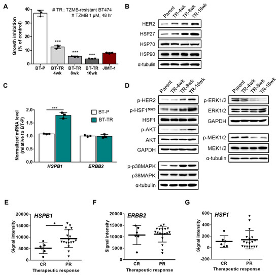 HSP27 is critically engaged in trastuzumab (TZMB)-resistance (TR) in HER2+ BC. (A) Resistance development was assessed every four weeks. The TZMB-mediated growth inhibitory effect decreased gradually and reached a level lower than that of the JIMT-1 cells at 16 weeks. Analysis of variance (ANOVA), *** p < 0.001 versus BT-P. (B) Changes in the HSP27 and HER2 levels were assessed in cell lines developing TZMB-resistance. Alterations in the HER2 level show a direct correlation with the HSP27 level. (C) mRNA levels of HSP27 and HER2 were evaluated in the BT-P and BT-TR cell lines. The HSP27 mRNA level was significantly upregulated in BT-TR cells, whereas no changes were observed in the HER2 mRNA level (n = 3). Student’s t-test, *** p < 0.001 versus BT-P. (D) Changes in several signaling pathways were comprehensively evaluated in TZMB-resistant cell lines. (E–G) Gene expression levels of HSP27 (E) HER2 (F) and HSF1 (G) were compared between complete responders (CR) and partial responders (PR) to TZMB (GSE62327). Significant alteration was found only in HSP27. Student’s t-test, * p < 0.05.