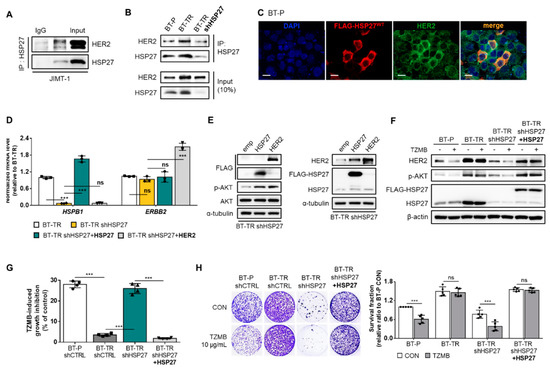 HSP27 directly modulates HER2 and its downstream protein kinase B (AKT) pathway to induce TZMB-resistance in HER2+ BC. (A) Direct interactions between HSP27 and HER2 were confirmed in JIMT-1 cells using immunoprecipitation assay. (B) Extent of the HSP27 and HER2 interaction was compared between BT-P and BT-TR cells. Binding between the two proteins was increased in BT-TR cells and was significantly reduced along with HSP27 knockdown. (C) HSP27-mediated upregulation of HER2 was confirmed by transiently overexpressing HSP27. The fluorescence intensity of HER2 was increased only in those cells in which overexpression of HSP27 was successfully induced. Scale bars = 20 μM. (D) Alterations in the mRNA level were assessed by silencing HSP27 in BT-TR cells and restoring HSP27 expression in BT-TR shHSP27 cells. In all cases, the mRNA level of HER2 did not change significantly (n = 3). ANOVA, *** p < 0.001. (E) The overexpression of HER2 and HSP27-mediated changes in the endogenous level of HER2 and HSP27 were evaluated. Transduction of HER2 did not change HSP27 expression. (F–H) Changes in TZMB responsiveness were assessed by silencing HSP27 in BT-TR cells and re-expressing HSP27 in BT-TR shHSP27 cells. HSP27 silencing significantly downregulated HER2 and phospho-AKT (p-AKT) ((F) 12 h treatment of TZMB), leading to short-term ((G) 48 h treatment of 10 μg/mL of TZMB) and long-term ((H) 10-day incubation with TZMB) growth inhibition in response to TZMB. Inversely, restoration of HSP27 in BT-TR shHSP27 completely rescued the TZMB-resistant phenotype. ANOVA, *** p < 0.001.