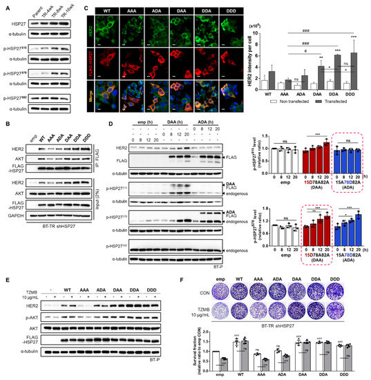 In general, HSP27 phosphorylation is well-known to regulate its chaperone activity [45]. HSP27 phosphorylation induces a structural shift from large oligomers to small dimers, which promotes chaperone activity [26,46,47]. HSP27 has three available serine phosphorylation sites, S15, S78, and S82, each of which can be phosphorylated by multiple kinases. Among them, p38MAPK is generally considered to be a major mediating enzyme [48]. As demonstrated in Figure 2D, the activity of p38MAPK showed a significant increase during the development of TZMB-resistance. Therefore, we investigated changes in the p-HSP27 level (Figure 4A). In this experiment, only the p-HSP27S15 and p-HSP27S78 levels displayed a gradual increase as resistance was acquired. No evident changes were found in the p-HSP27S82 level. For further evaluation, we prepared five different phospho-variants along with HSP27WT (WT): HSP27S15A/S78A/S82A (AAA), HSP27S15A/S78D/S82A (ADA), HSP27S15D/S78A/S82A (DAA), HSP27S15D/S78D/S82A (DDA), and HSP27S15D/S78D/S82D (DDD). Each of the three sites was replaced with either a non-phosphorylatable alanine (A) or a phosphomimetic aspartate (D). We transiently and stably introduced the constructs into BT-P and BT-TR shHSP27 cells, respectively, and examined the significance of phosphorylation at each site for the HSP27-HER2 interaction and TZMB-resistance in detail.