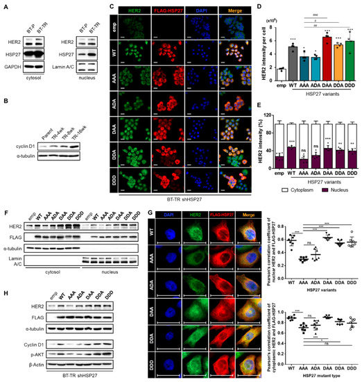 The overexpression of HER2 and HSP27 proteins in BT-TR cells was found not only in their sub-cytoplasmic fraction, but also in the sub-nuclear compartment (Figure 5A), inducing the distinctive role of nuclear HER2 as a transcriptional coactivator that promotes cyclin D1 expression (Figure 5B). Diverse studies have previously reported that the nuclear fraction of HER2 is involved in cell growth, metastasis, invasion, and resistance to various chemotherapeutic agents in BC [49]. Particularly for TZMB, HER2 in the nucleus distinctively assembles a STAT3/HER2/HER3 nuclear complex that triggers the promoter activity of CCND1 to escape the growth inhibitory effect of TZMB [50]. To elucidate the role of HSP27 phosphorylation in the nuclear localization of HER2, we performed an IF assay (Figure 5C). In accordance with the prior results, the average HER2 intensity per cell was higher in the groups harboring S15D (DAA, DDA, and DDD) than in the S15A-containing cases (AAA and ADA) (Figure 5C). Surprisingly, even the S15D mutation alone (DAA) was sufficient to increase the HER2 level to a similar extent to that with DDA and DDD (Figure 5D). In the case of ADA, which holds only the S78D mutation, the HER2 level was upregulated to a smaller degree than with DAA, DDA, or DDD (Figure 5D). Moreover, in accordance with the alterations in the total HER2 level, the nuclear fraction of HER2 in the AAA and ADA-expressing cells did not exhibit notable changes (Figure 5E,F). However, the phospho-variants DAA, DDA, and DDD, which commonly hold the S15D alteration, significantly upregulated the nuclear fraction of HER2 (Figure 5E,F). Along with increase in the nuclear fraction of HER2, a considerable proportion of DAA, DDA, and DDD mutants were also found in the nucleus, whereas the AAA and ADA mutants were mainly retained in the cytoplasm (Figure 5G). Strong colocalization patterns were also observed between the nuclear fraction of the DAA, DDA, and DDD mutants and HER2 (Figure 5G), suggesting that HSP27 interacts directly with HER2 not only in the cytoplasm, but also in the nucleus to enhance the distinct function of nuclear HER2, which is promoting AKT activation and cyclin D1 expression (Figure 5H).