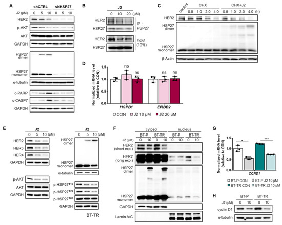 J2 attenuates HER2 stability in TZMB-resistant BC cells by inhibiting the function of HSP27 through altering dimerization. (A) The activity of J2 as a direct functional inhibitor of HSP27 was confirmed using BT-TR shHSP27 cells. The compound lost its activity to create abnormal dimers of HSP27 and failed to downregulate HER2 and its downstream AKT pathway (12 h treatment at indicated concentrations). (B) The effect of J2 on the HSP27–HER2 interaction was evaluated by co-IP assay. The interaction between HER2 and HSP27 was significantly reduced in a dose-dependent manner by treatment with J2 (12 h treatment at the indicated concentrations). (C) J2-mediated downregulation of HER2 stability was assessed using a cycloheximide (CHX) chase assay. Co-treatment with CHX (5 μg/mL) and J2 (20 μM) accelerated the degradation of HER2 by creating altered dimers of HSP27. (D) Changes in the mRNA level of HSP27 and HER2 were measured after applying the compound at the indicated concentrations. No significant alterations were found in either HSP27 or HER2 mRNA expression (12 h treatment at indicated doses, qRT-PCR, ACTIN as loading control). (E) The effect of J2 on HER-related signaling molecules was evaluated in BT-TR cells by applying the compound in the indicated concentrations. Significant, concentration-dependent attenuation was observed in HER-family proteins and the downstream AKT pathway (12 h treatment at indicated doses). (F) Changes in the HER2 level in different subcellular fractions of BT-P and BT-TR cells were examined, to evaluate the influence of J2 on the cytoplasmic and nuclear functions of HER2. A significant decrease was observed in both fractions of HER2 (12 h treatment). (G,H) Consequential downregulation of cyclin D1 mRNA (G, 12 h treatment, ACTIN as loading control) and protein ((H) 12 h treatment) was observed following J2 treatment. ANOVA, * p < 0.05, *** p < 0.001 versus CON.