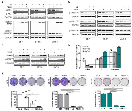 J2 sensitizes TZMB-resistant cell lines to successfully restore significant anticancer activity of TZMB. (A) The effect of co-treatment with J2 (10 μM) and TZMB (10 μg/mL) on HER2 and its downstream AKT signaling pathway was assessed in three different cell lines, BT-P, BT-TR, and JIMT-1. The HER2 and p-AKT levels were most significantly reduced in the co-treatment group, which also showed enhanced alterations in HSP27 dimerization (12 h treatment of both drugs). (B) Marked reduction in S15 and 78 phosphorylation was observed in the co-treatment group. No changes were found in S8 phosphorylation. The experimental conditions used in (A) were also applied here. (C) The effect of co-treatment with J2 (10 μM) and TZMB (10 μg/mL) on apoptosis signaling was assessed in three different cell lines, BT-P, BT-TR, and JIMT-1. Pro-apoptotic markers in the co-treatment group were significantly upregulated, along with enhanced alterations in HSP27 dimerization (24 h treatment of both drugs) (D) Remarkable synergism of growth inhibitory effect was observed in the group co-treated with J2 and TZMB (48 h treatment of both drugs). ANOVA, *** p < 0.001 versus TZMB-only group. (E) Long-term proliferation rate was also markedly inhibited in the TZMB + J2 group (10-day incubation). ANOVA, *** p < 0.001 versus CON.
