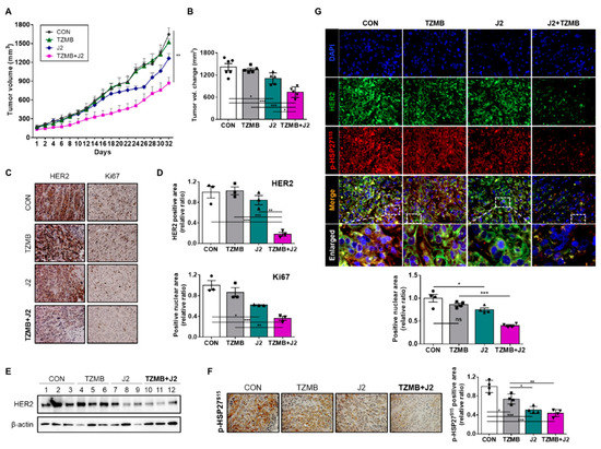 The tumor growth rate was most retarded in the group that received both TZMB and J2 (Figure 8A), and the final tumor volume change was smallest in that group (Figure 8B). Our IHC analysis also revealed that HER2 level was most remarkably downregulated in the tumor tissues of the co-treated group (Figure 8C–E), along with a significant decrease in the Ki67 level (Figure 8C,D), which indicates a reduced proliferation rate. Moreover, the phosphorylation level of HSP27 S15 and the nuclear translocation of HER2 and p-HSP27S15 were greatly reduced in tumor tissues excised from the TZMB + J2 group (Figure 8F,G), once again confirming the finding that downregulating the chaperone activity of HSP27 by inhibiting S15 phosphorylation could allow TZMB-refractory BC patients to obtain clinical benefit from TZMB, by reducing the stability of overexpressed HER2, and placing it in a pregnable state.