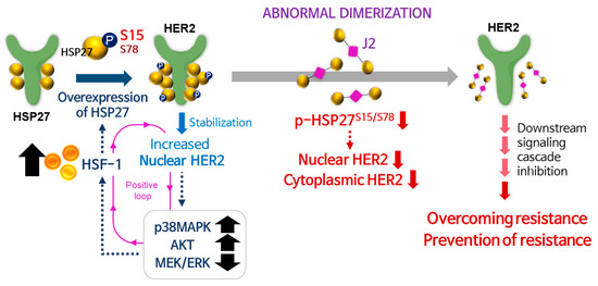 Graphical summary of overall findings of the study. HSF1-mediated HSP27 upregulation and its S15 phosphorylation leads to increase in HER2 nuclear function, reducing the TZMB susceptibility overall. Administrating J2, a functional inhibitor of HSP27, can serve as an effective overcoming and/or preventing strategy for TZMB-resistance.