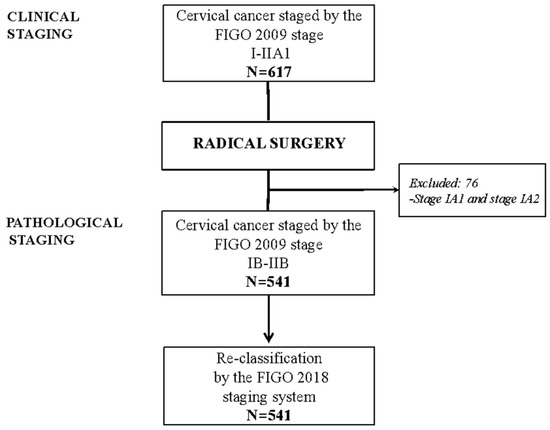 Between 1997 and 2018, 617 patients were clinically staged as FIGO 2009 I - IIA1, according to the inclusion criteria. After surgery, 76 patients classified as being stages IA1and IA2 were excluded, leaving 541 patients that were appropriate for statistical analysis (Figure 1).