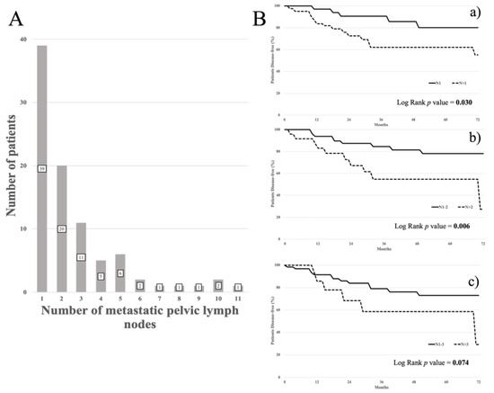 The prognostic value of utilizing the number of metastatic pelvic LNs was also confirmed in the OS analysis despite the fact that DFS might be related to several basic clinical, anatomical, and/or pathological features of the tumor, or by other factors, such as the site [32,33] and management of recurrence [34,35,36].