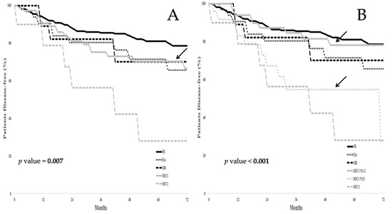 (A) Disease free survival (DFS) in the whole series according to the FIGO 2018 staging system; (B) DFS in the whole series according to the proposed FIGO 2018 staging system. Arrows highlight the DFS curve for stage IIIC1 in panel A, as well as the subgroups N1-2 and n > 2 in panel B.