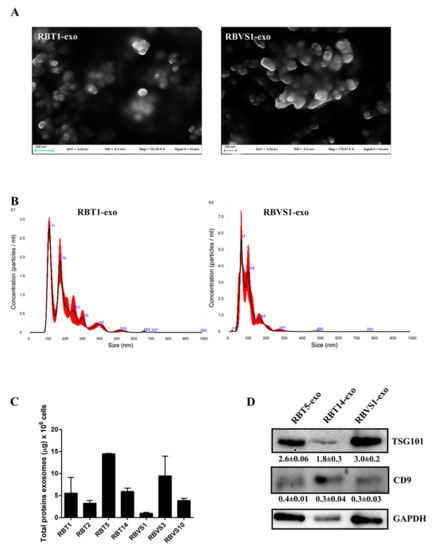 Characterization of retinoblastoma tumor (RBT)- and RB vitreous seeding (RBVS)-derived exosomes. (A) Scanning electron microscopy (SEM) showing a population of heterogeneous-sized exosomes isolated from representative RBT1 and RBVS1 cell lines. Scale bar: 200 nM. A higher magnification image was reported for RBVS1. Scale bar: 100 nM. (B) Graphics representing size distribution of nanoparticles resulting from NanoSight particle-tracking analysis of RBT1 and RBVS1, taken as representative of all RB cell lines. (C) Quantity of total exosomal protein for 106 cells of the different RB cell lines analyzed. (D) Western blot analysis of the typical exosomal proteins, TSG101 and CD9 for two RBT and one RBVS representative cell lines. GAPDH was reported as loading control. Detailed information about western blot can be found at Figure S1.