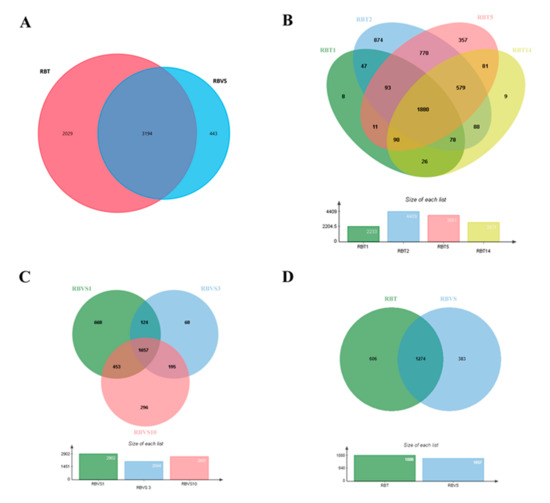 Proteomic analysis of RBT- and RBVS-derived exosomes. (A) Venn diagram of the total number of detected proteins in RBT and RBVS-derived exosomes. (B) Venn diagram of proteins identified in single RBT1, RBT2, RBT5 and RBT14 cell lines. Notably, 1880 proteins resulted present in exosomes obtained from all RBT cell lines. (C) Venn diagram of proteins detected in single RBVS1, RBVS3 and RBVS10 cell lines. Moreover, 1657 proteins were shared by all the samples. (D) Additionally, 606 proteins were exclusively present in RBT-derived exosomes, while 383 proteins were exclusively present in RBVS-derived exosomes. Furthermore, 1274 proteins were shared by the two groups.