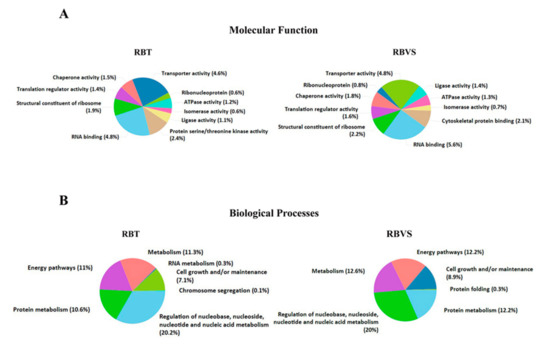 Gene enrichment analysis was performed by FunRich software [14], to characterize exosomal RBT and RBVS proteins, based on molecular function (Figure 3A) and biological processes (Figure 3B). Functionally, the proteins were associated in both groups with RNA binding (4.8% RBT; 5.6% RBVS); transporter activity (4.6% RBT; 4.8% RBVS); translation regulatory activity (1.4% RBT; 1.6% RBVS); chaperone activity (1.5% RBT; 1.8% RBVS); ligase activity (1.1% RBT; 1.4% RBVS); ATPase activity (1.2% RBT; 1.3% RBVS) and isomerase activity (0.6% RBT; 0.7% RBVS). Moreover, 1.9% and 2.2% for RBT and RBVS, respectively, clustered as structural constituent of ribosome, while 0.6% in RBT and 0.8% in RBVS as ribonucleoprotein. Proteins with serine/threonine kinase activity were present only in exosomes derived from RBT (2.4%), while cytoskeletal binding activity exclusively in exosomal RBVS associated proteins (2.1%). Clustering based on the involvement in biological processes (Figure 3B) revealed proteins involved in regulation of nucleic acid metabolism (20.2% RBT; 20% RBVS), energy pathways (11% RBT; 12.2% RBVS), metabolism (11.3% RBT; 12.6% RBVS), and cell growth and/or maintenance (7.1% RBT; 8.9% RBVS).